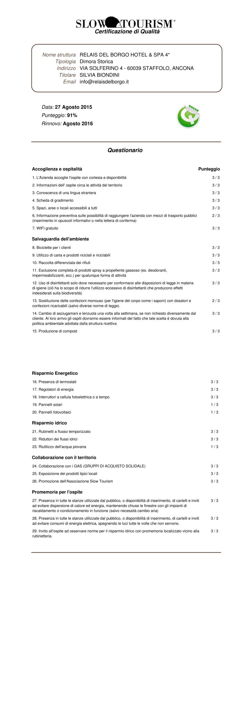 I materiali ecologici ed ecosostenibili utilizzati nella ristrutturazione, come l’argilla per la termoregolazione naturale, le terre crude per gli intonaci e i rubinetti Hansgrohe a risparmio idrico, uniti alle moderne tecniche di riscaldamento e raffrescamento a parete, di cui tutta la struttura è dotata, fanno del Relais del Borgo un armonico connubio di storicità, elevato comfort abitativo e attenzione all'ambiente.